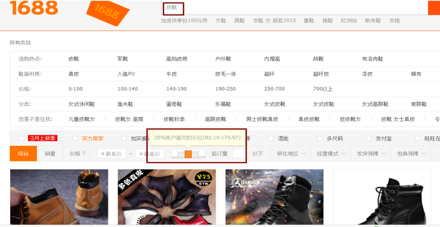 第一步,在首页搜索框中输入关键词,如皮靴,紧接着在综合排序那一排选择价格和自己产品适当或者相近的来看数据!