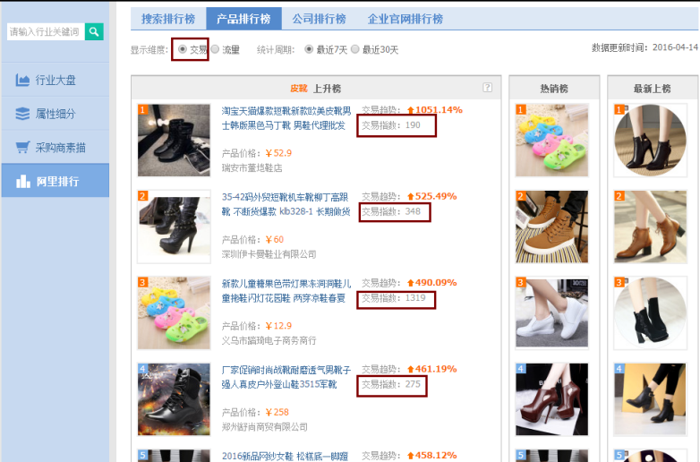 一是交易,主要看这里的交易指数(当然还要看上升榜、热销榜、最新上榜)。二是流量,因为流量关系到每天会有多少客户到店铺当中,且和转化率有很大关系。所以这里需要看的是流量指数,且可以看7天或者是30天(建议参考30天,这样就能明白为什么别人占据榜首位置久居不下了)。