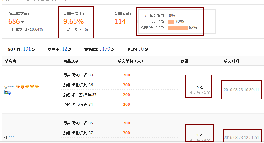 第二步,打开首页的每一款产品,去查看详情页中的成交信息(包括成交数、重复采购率、采购人数、采购数量、成交时间)。记住,一定要详细记录下首页所有竞争对手的这些数据,它的作用有以下几点: