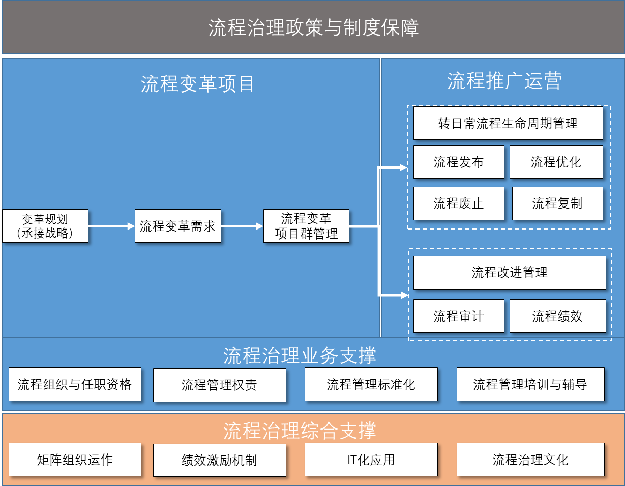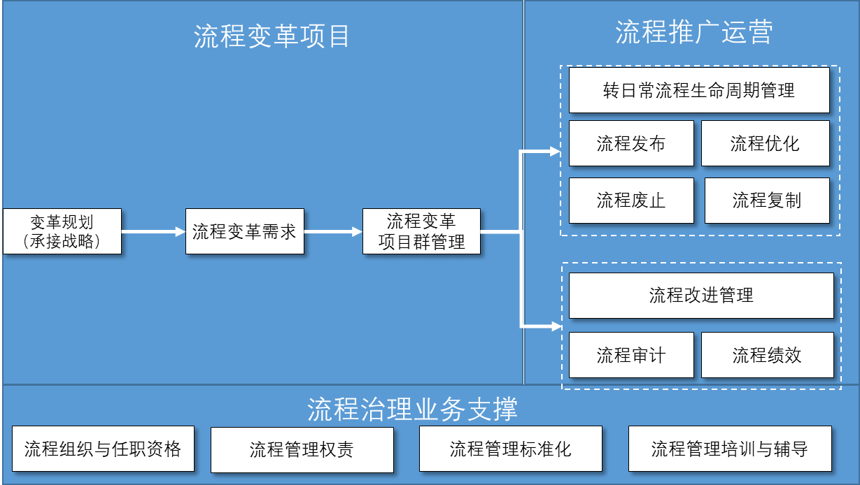 流程管理组织 | 流程变革规划管理 | 流程变革需求管理 | 流程变革项目管理 | 流程生命周期管理 | 流程改进管理 | 流程支撑管理 | |