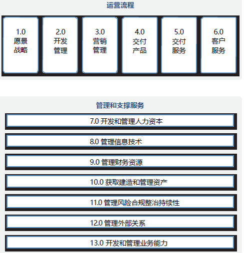 1)业务域组织:流程变革项目来源于战略规划,依据战略规划做好整体业务架构,业务架构会将企业分解几个核心的业务域,比如APQC中将企业分解为如下业务域: