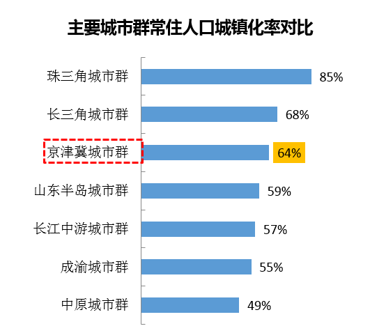 目前,京津冀城市群常住人口城镇化率为64%,高于我国常住人口城镇化率57.4%。京津冀三地,北京、天津的城镇化率较高,分别为87%及83%,但是河北城市密度不高,城镇化水平比较低,河北省2016年常住人口城镇化率为53.32%,低于全国平均水平4个百分点,因此,提升河北省的城镇化水平,是建设京津冀世界级城市群的一个重要任务。2020年河北省城镇化率达到2016年全国水平57.4%,预计有300万人实现城镇化;如果能达到长三角城市群68%的水平,预计至少将有1000万人实现城镇化。