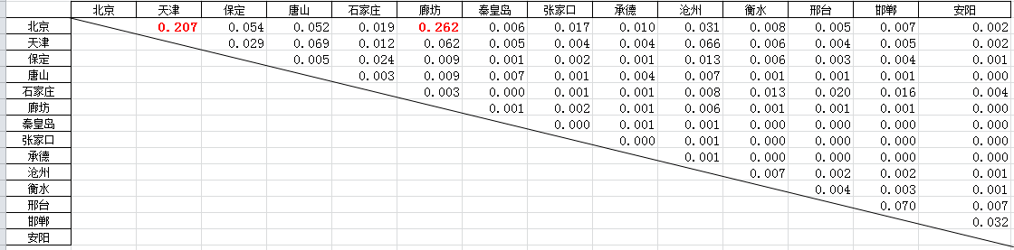 从京津冀内部城市经济联系强度表可以看出,北京和廊坊(0.262)北京与天津(0.207)联系最为密切。