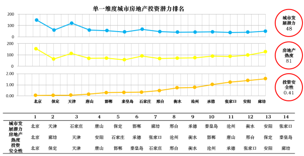 我们从城市发展潜力、房地产市场热度、投资安全性三个单一维度给出城市群各城市排名情况如下图: