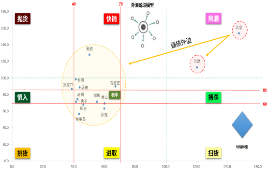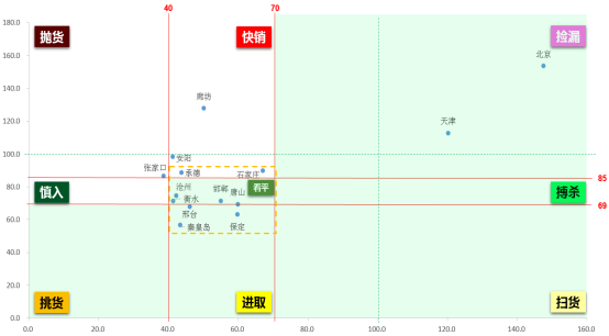 根据九宫格模型得出京津冀城市群作战地图,主攻城市有承德、张家口、沧州、邯郸、唐山、天津、石家庄、保定、邢台、秦皇岛、衡水等城市。