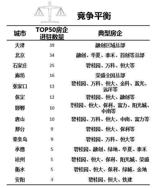 充分考虑TOP50房企之间的竞争平衡,天津、北京、石家庄、廊坊、张家口、保定等城市房企进驻数量较多,应重点关注市场竞争带来的非理性拿地风险。