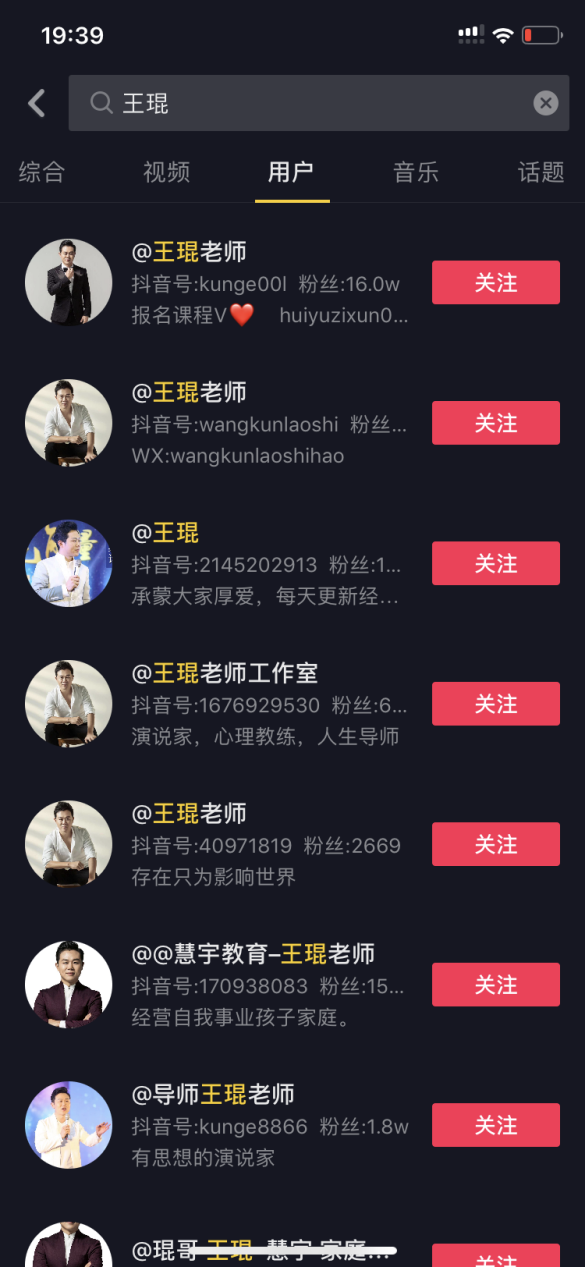 我们来看一下抖音里两位培训讲师的矩阵操作。搜索关键词,可以看到很多账号都和这两位讲师相关,如图3-3所示。笔者点开了几个账号,发现粉丝都是几万、几十万,甚至上百万。这些账号的粉丝,全部加在一起,是非常庞大的数据。这么多账号,每天同时发布同一老师的内容,传播力自然非常惊人,吸引的粉丝也非常精准。