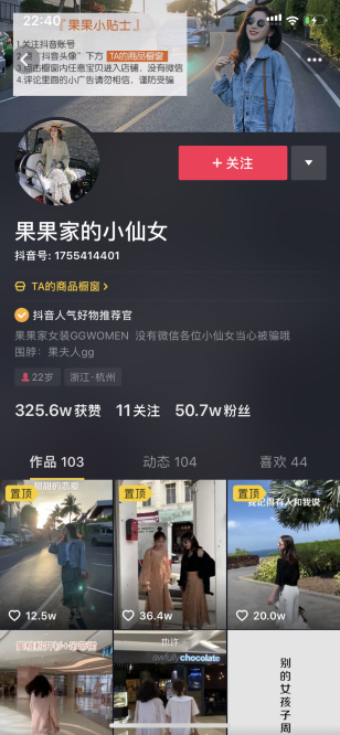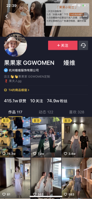 通过抖音矩阵的运营,大量粉丝被引流到淘宝店铺进行转化,果果家淘宝店铺的粉丝关注数量高达1064万(图3-5)。这么多的关注量,实际产生的营销价值大家可想而知。在传统服装店生意艰难的环境下,果果家服饰利用抖音矩阵,成功引流精准粉丝,批量营销,非常值得借鉴学习。