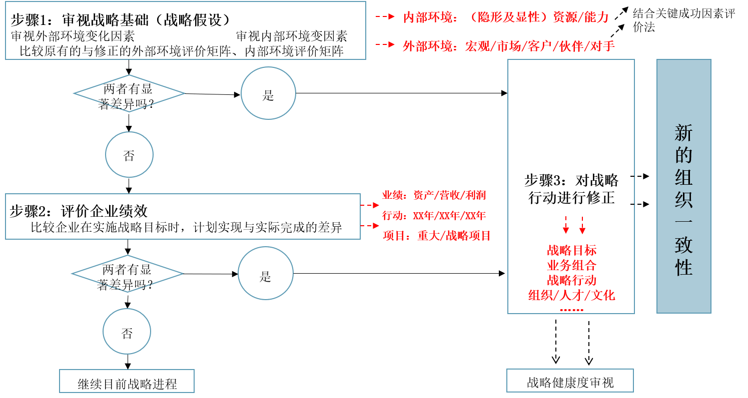 在战略过程的前三大环节——战略规划、战略解码与执行中,人们比较关注,但是战略管理流程的最后一个环节——战略评估,却经常被人忽视。实际上,战略评估非常重要,且有规律可循,如图15-5所示。