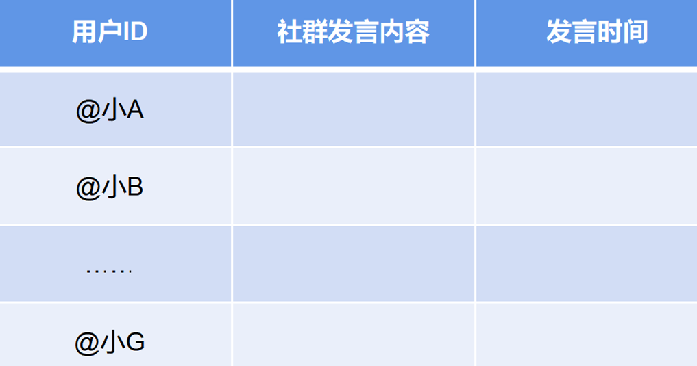 类似这种对用户特征描述的数据分析,我们称之为用户数据字段。对于社群运营数据分析而言,收集用户数据字段是用户数据分析最原始的环节。在之前讲数据分析体系搭建时,第二步就是要梳理关键节点和关键节点上对应的数据指标,这里面就包括用户数据字段的收集。基于社群运营场景,通常我们会收集的用户字段包括用户基本数据和用户行为数据这两类关键数据指标