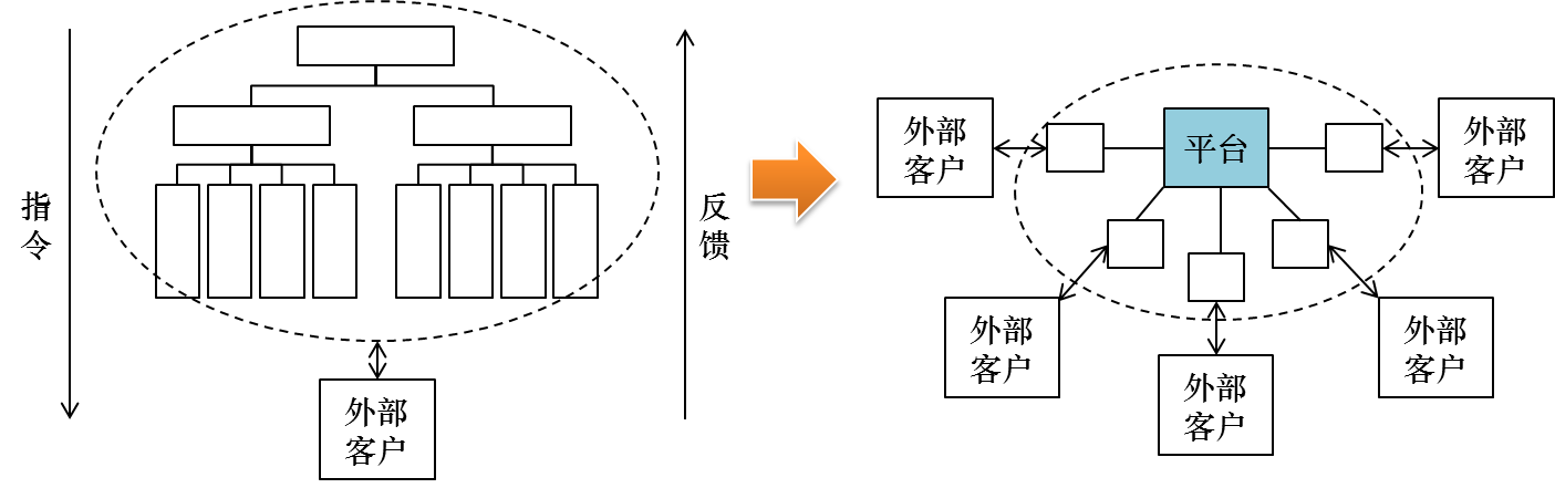 以海尔为例,其组织变革的核心是拉近企业与用户需求之间的距离,由企业制造转变为用户需求拉动,由传统的科层制组织模式转变为多触角、直入用户的生态组织模式,实现企业组织的平台化,如图2-1所示。