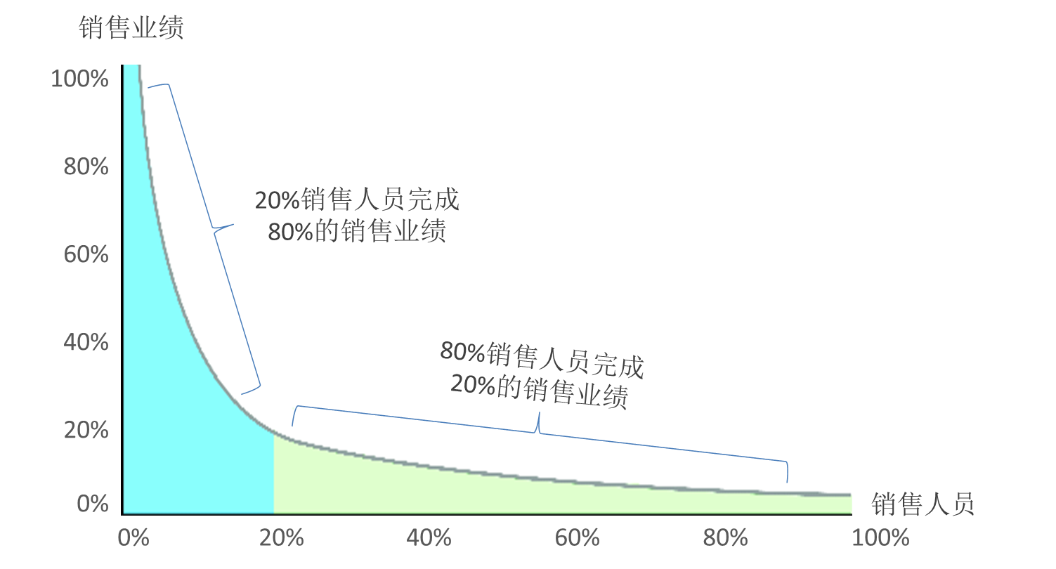 在某些行业和企业,销售人员的业绩呈幂律分布(如图7-4所示),也就是20%的顶尖销售人员完成80%的销售业绩。在这样的情况下,激励20%的顶尖销售人员是销售薪酬激励计划的首要任务。对于销售人员绩效呈幂律分布的企业,更高的激励杠杆起着不可替代的作用。一个最优秀的销售人员的收入应该是多少?是不是可以超过他的销售经理和销售总监,甚至成为企业中收入最高的一员呢?事实上,大多数情况下,销售人员很难成为企业中收入最高的人。在竞争白热化的商业环境中,高收入销售人员可能每年都是不同的人,高收入的实际金额也可能每年都在上下波动。然而,那些对自己的能力充满信心,对销售业绩雄心勃勃的销售人才来说,激励杠杆预示的收入上浮潜力是销售薪酬激励计划最激动人心的部分之一。顶尖销售人员的激励杠杆表明一个企业的价值观,显示企业吸引和留住行业最佳销售人才的能力。