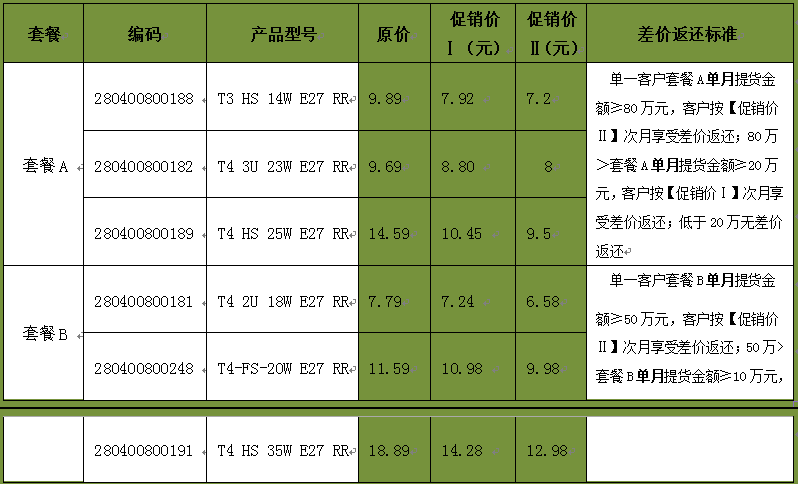 为响应“济南节能灯1.5会议”决议,全面打响五金市场光源产品的“清洗战”,奠定行业“节能灯霸主”地位,经公司领导决议,特在五金渠道开展为期3个月的重点品类推广、跟进以及终端打击竞争对手的价格战。望各区域做好战前动员,备足战斗品库存(备注:六朵金花II)及终端物料准备,全面出击,赢取战争的胜利。