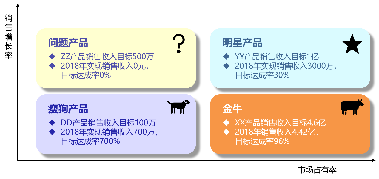 在2018年,除了现金牛XX老产品较好地完成了目标(销售目标完成率96%),原计划成为公司明星产品的YY,销售目标完成率仅为30%。新产品ZZ销售收入为0,也未完成目标。而本应淘汰的瘦狗类产品DD,却销售了700万元(原计划销售100万元)。