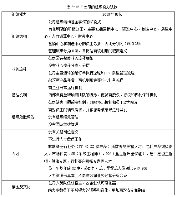 识别出T公司2018年的关键任务后,接下来我们对T公司的组织能力现状进行了摸底调查,见表5-12。
