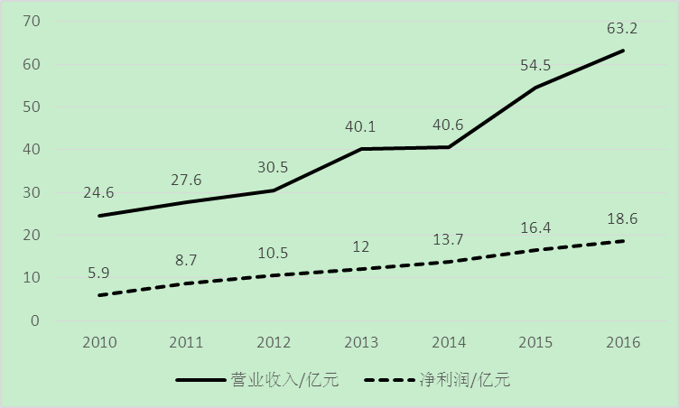 图6-14 2010-2016年东阿阿胶营业收入及净利润
