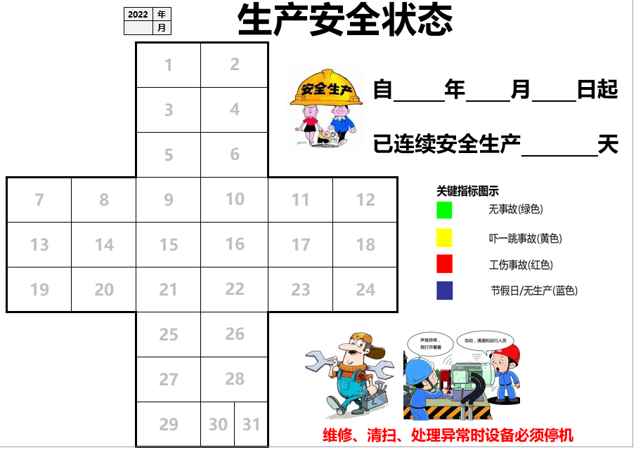 班组长可以用A4纸打印一个十字格,在上面写上日期,每一个格子需要涂不同的颜色,其中绿色代表当天无事故发生,黄色代表吓一跳事故,红色代表工伤事故,蓝色代表当天休息,没有生产作业。