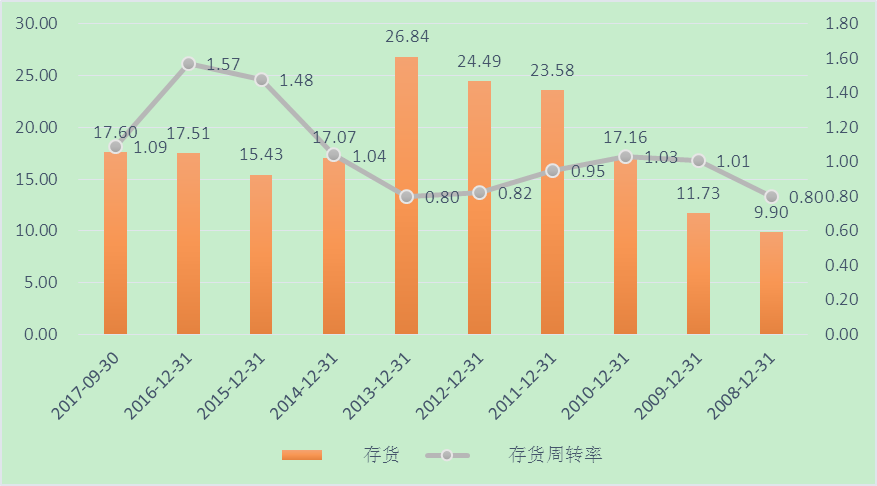 首先是公司A的存货余额及存货周转率,2008年至2013年,存货年年增加,由9.9亿元增加至2013年的26.84亿元。存货周转率也在逐年上升,因此在2014年大额计提存货跌价准备。此后,存货价值依然在上升,同时存货周转率居高不下,不得不在2017年继续计提存货跌价准备。如图1-6所示。