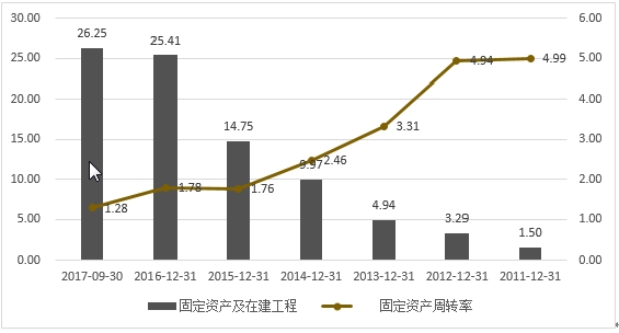 再看公司B,其固定资产从2011年开始大幅增长,从2011年的1.50亿元增长至2017年三季度末的26.25亿元,同时固定资产周转率由4.99大幅降低为1.28,该企业在2017年也被爆出有造假嫌疑。如图1-7所示。