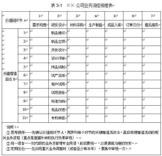 例如,×× 公司业务流程梳理表(见表 3-1)以研发设计环节 A2 为例,通过企业内部的讨论分析,研发设计环节是由以下关键增值活动 B 构成的:新品建议 /B1、新品立项 /B2、开发设计 /B3、设计评审 /B4、样品试制 /B5、试产总结 /B6、客户试用 /B7、试用报告 /B8、标准归档 /B9、老品改进 /B10、专利