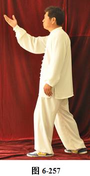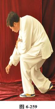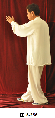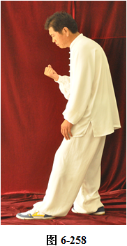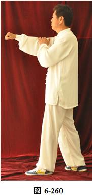 接上式,右腰向右外微转,身体随之右转,重心移于右腿。左腰微提,左脚由右脚内侧走弧形向左前方迈出一步;左臂随转腰重心落于右腿之际,往右里划弧形。腰上提,呈左弓步,随之左臂划落至左胯侧旁,掌心向下。右臂随重心落于右腿时向后摆,随右腰上提,由后经右耳侧划弧形拍出,掌心斜向左;腰向后微拱,重心落于右腿,呈后坐式。右手掌随腰后拱之势,收回胸前变松握拳; 右拳随之翻转拳心向下,外展后栽落左膝前下方,上身微俯,左掌随向下栽捶之际,顺势搭在右臂肘弯处;腰上提走弧形,右拳向前上方划弧缓缓崩拳,眼神注视前方(见图6-256至6-260)。