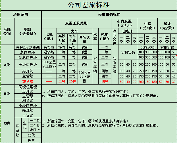 打仗是需要粮草的,所谓“兵马未动,粮草先行”。根据城市的级别和消费水平,对出差补助费用做差异化的设置,如表1-4所示。