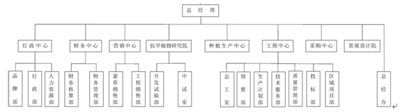 蒙草抗旱逐渐形成“六个中心,两个院”的组织架构,保障整个体系的良性运转。包括:行政中心——下设品牌部、行政部和人力资源部,财务中心——下设财务管理部和财务核算部,营销中心——下设蒙草销售部和工程销售部,工程中心——下设总工室、预算部、生产计划部、技术服务部、质量管理部、投标部、区域项目部,以及种植生产中心与采购中心六大中心。两个院是景观设计院和抗旱植物研究院,后者下设开发试验部和中试室。