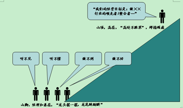 我接着对董事长说:“为什么你觉得很累,下面又总是执行不到位呢?因为你在山顶,基层甚至中高层还在半山腰和山脚下。公司说要提高产品竞争力,但下面很多人听不见,因为你可能只对部分中高层提了要求,公司内部没有工作计划的分解体系,很多人未必知道公司的决策。有些人知道了,但听不懂,因为他们不理解提高产品竞争力和自己有什么关系,就像刚才说的五星级服务,公司上下没有达成共识。有些人听懂了,但未必能做到,因为提高产品竞争力不是一个部门能完成的,所有部门协同才能实现这些目标。缺少统一的认识和具体的行动计划,事情往往做不好。再加上缺乏有效的战略执行过程监控,也没有问责制度,时间长了,公司再说提高产品竞争力,大家就习以为常了,反正也做不到,公司的要求也就成了口号。”