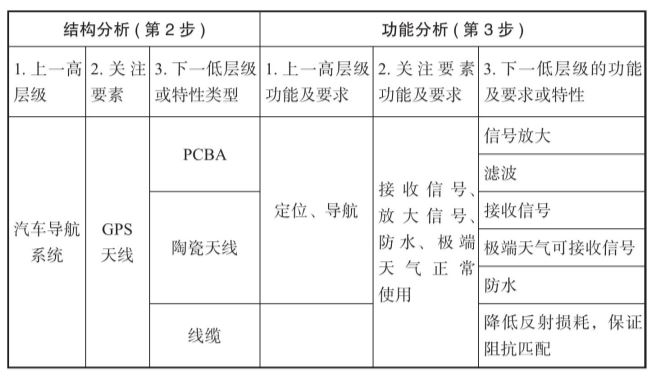 结构分析和功能分析中,DFMEA分析表中的1、2、3要一一对应,比如GPS由三大部分组成,功能分析中2关注要素功能及要求分析的是GPS天线的功能要求。结构分析中3有PCBA,功能分析中3就是分析PCBA的功能及要求——信号放大和配合组装功能。如表3-4所示。